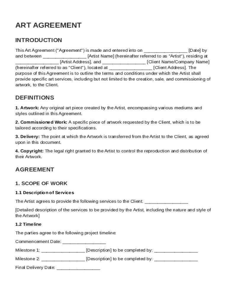 An Art Agreement Template is a legal document that outlines the terms and conditions of a partnership between artists and clients regarding commissioned artwork.
