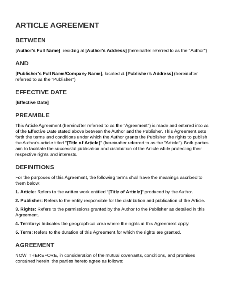 The article agreement formalizes the relationship between the author and the publisher, detailing how rights are managed and what obligations each party has.