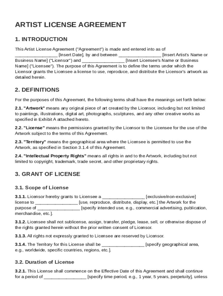 An Artist License Agreement Template is a legal document that outlines the terms under which an artist grants permission for their work to be used by another party.
