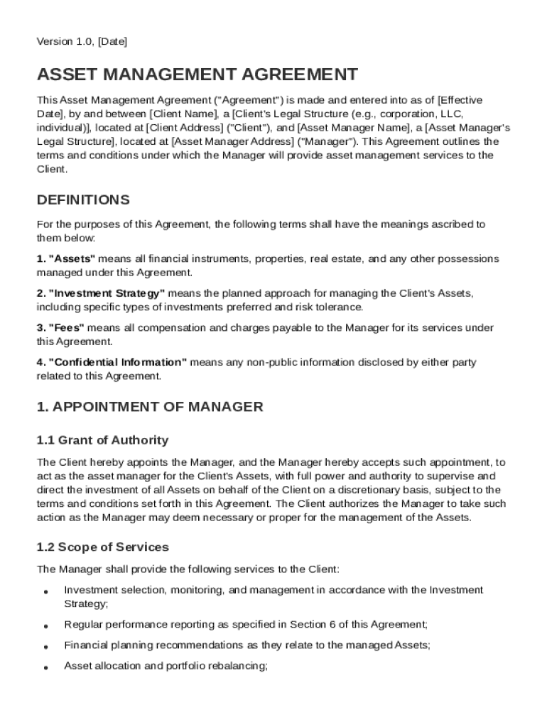 An Asset Management Agreement Template is a legal document that outlines the terms and conditions under which an asset manager will manage an individual's or organization's assets.