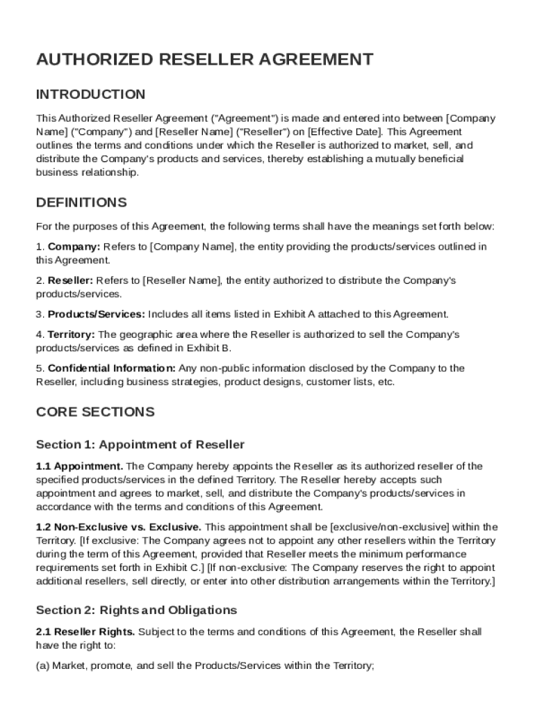 This document outlines the terms and conditions under which a reseller is authorized to market, sell, and distribute a company\'s products and services, establishing a business relationship.