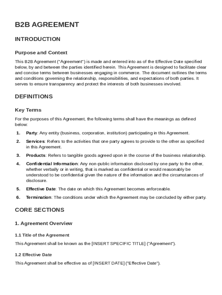 A well-structured B2B agreement consists of several key sections that provide the necessary detail for both parties. The core sections include fundamental information about the agreement itself, an overview of services, product specifics, and confidentiality terms. Understanding these core components helps parties draft agreements that are not only legally sound but are also tailored to their specific business needs.