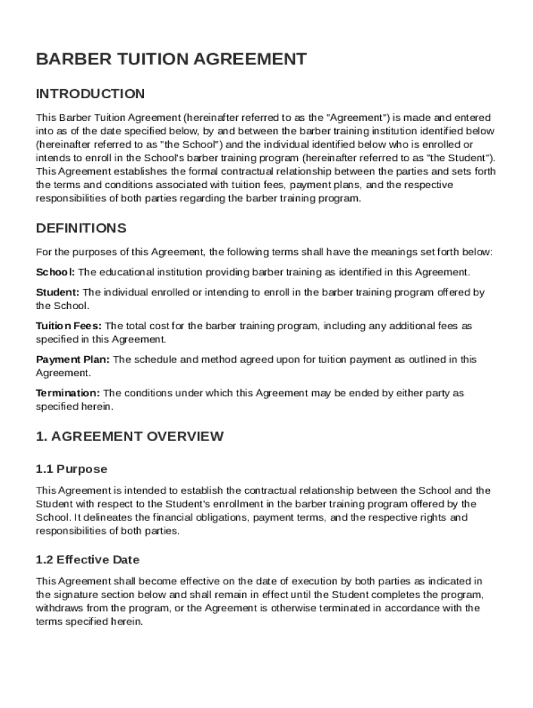 Understanding specific terms within the Barber Tuition Agreement is crucial for both students and administrative staff. These definitions provide clarity on the responsibilities and roles of all parties involved.