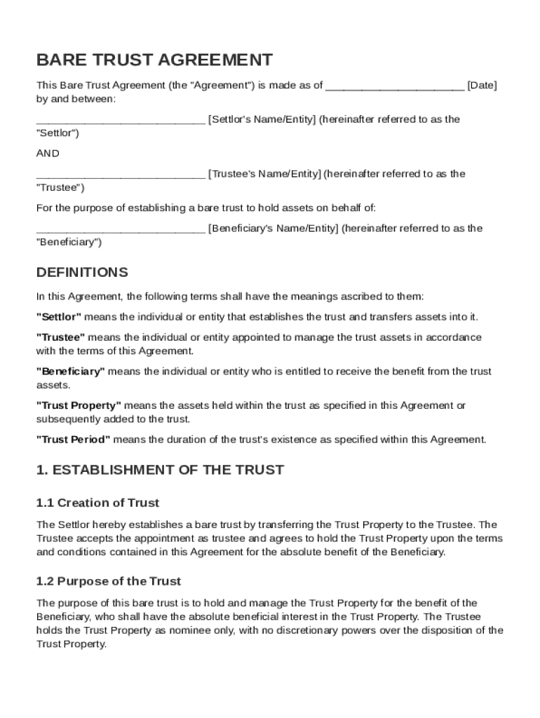 This document establishes a bare trust which holds assets on behalf of a beneficiary, detailing the roles and responsibilities of the settlor, trustee, and beneficiary.