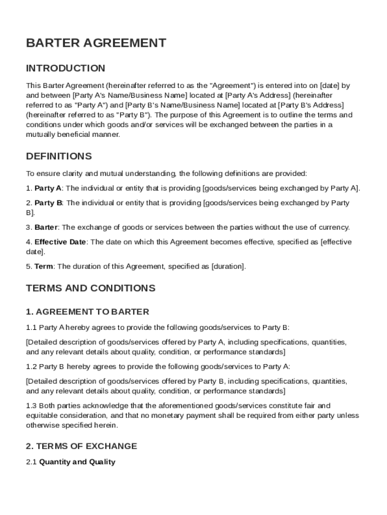 A barter agreement is a legally binding contract where two parties agree to exchange goods or services without the use of money. This type of agreement is increasingly popular due to its ability to facilitate transactions in both personal and business contexts.