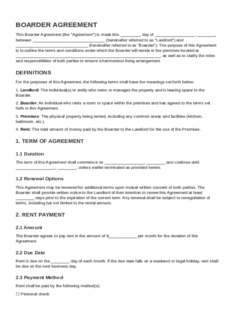 Understanding the foundational aspects of a Boarder Agreement Template is crucial for both landlords and tenants. Here are some key provisions typically included: