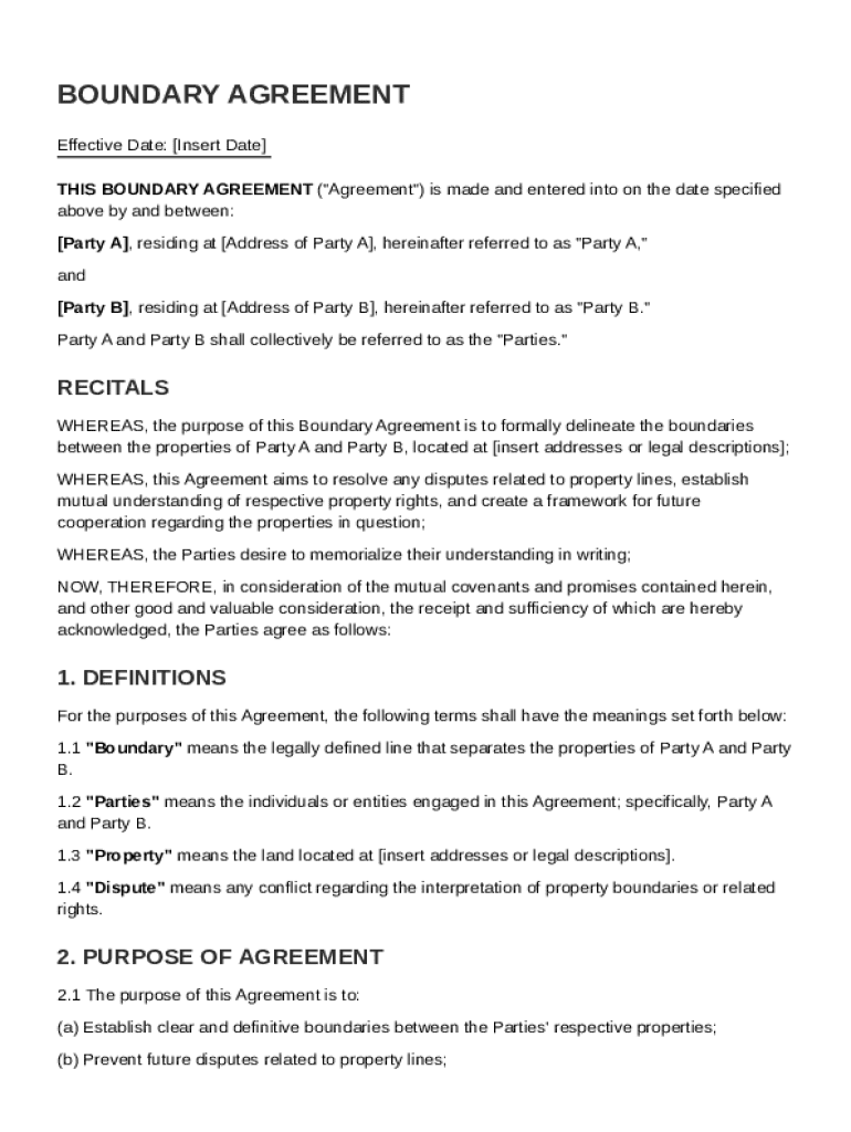 A Boundary Agreement Template is a legal document used to outline and agree upon the boundary lines between adjoining properties.