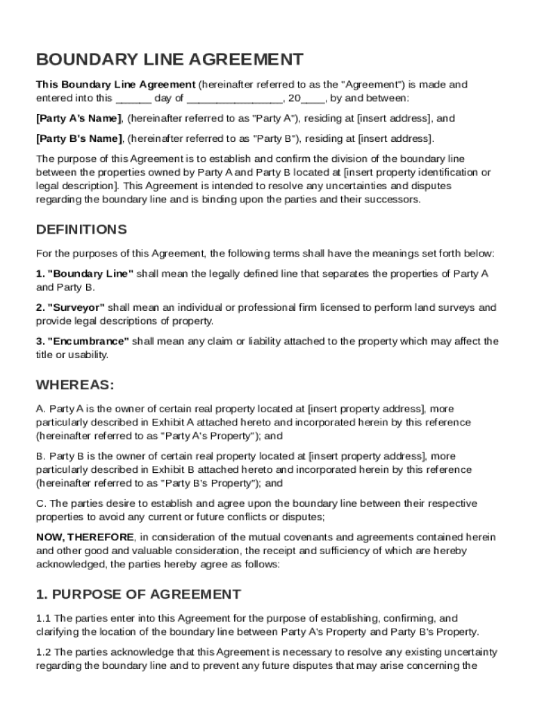 A Boundary Line Agreement Template is a legal document outlining the agreed-upon boundaries between two or more property owners.