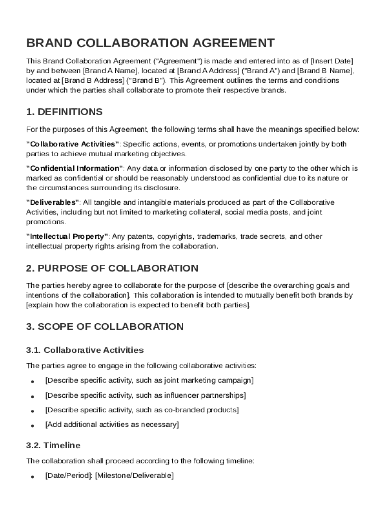 Establishing a timeline within the Brand Collaboration Agreement ensures that all parties are aligned in their expectations. Key milestones should be clearly identified to track the progress of collaborative efforts.