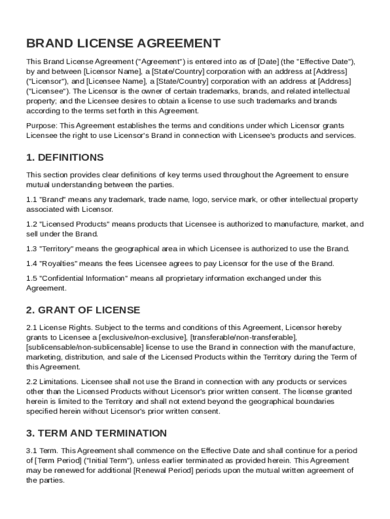 Drafting a Brand License Agreement requires precision and clarity. Start with clear definitions of terms used throughout the document to avoid ambiguity.