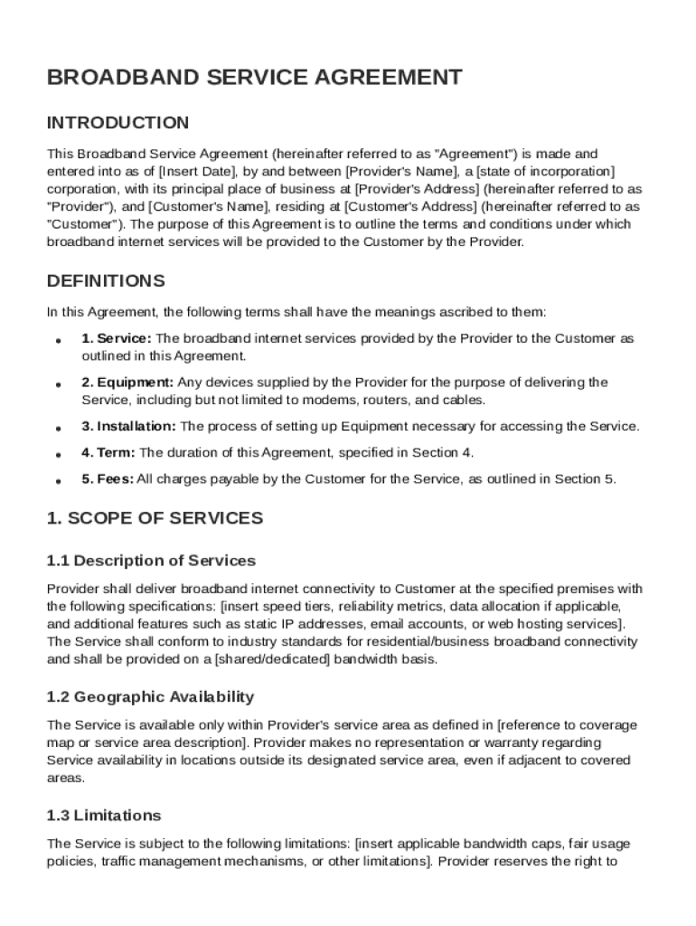 This Agreement outlines the terms and conditions under which broadband internet services will be provided to the Customer by the Provider.