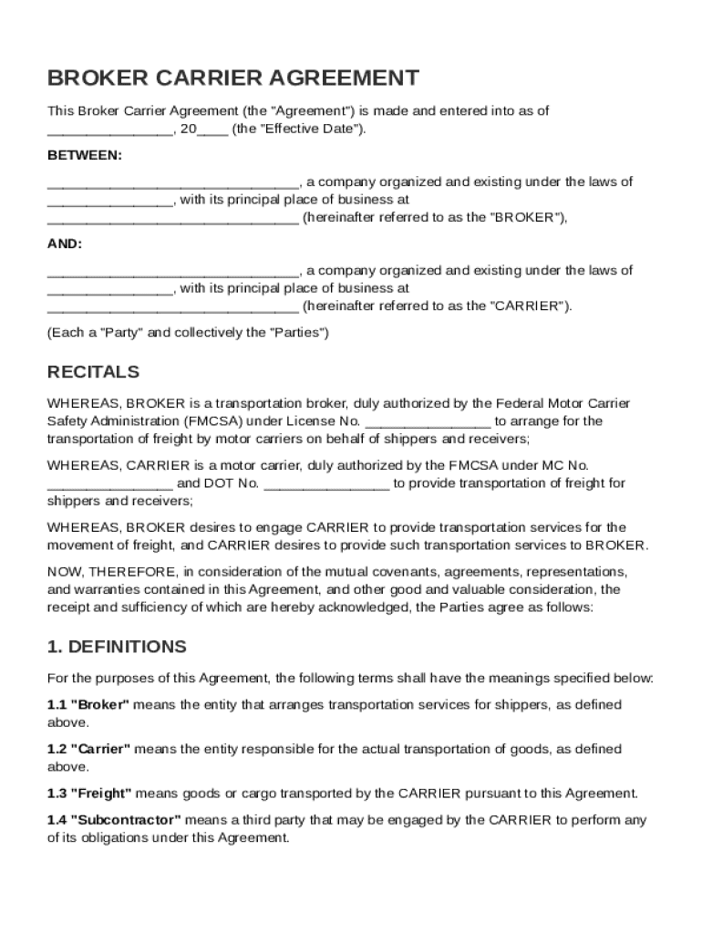 Clearly identifies the broker and the carrier, including their roles within the agreement.