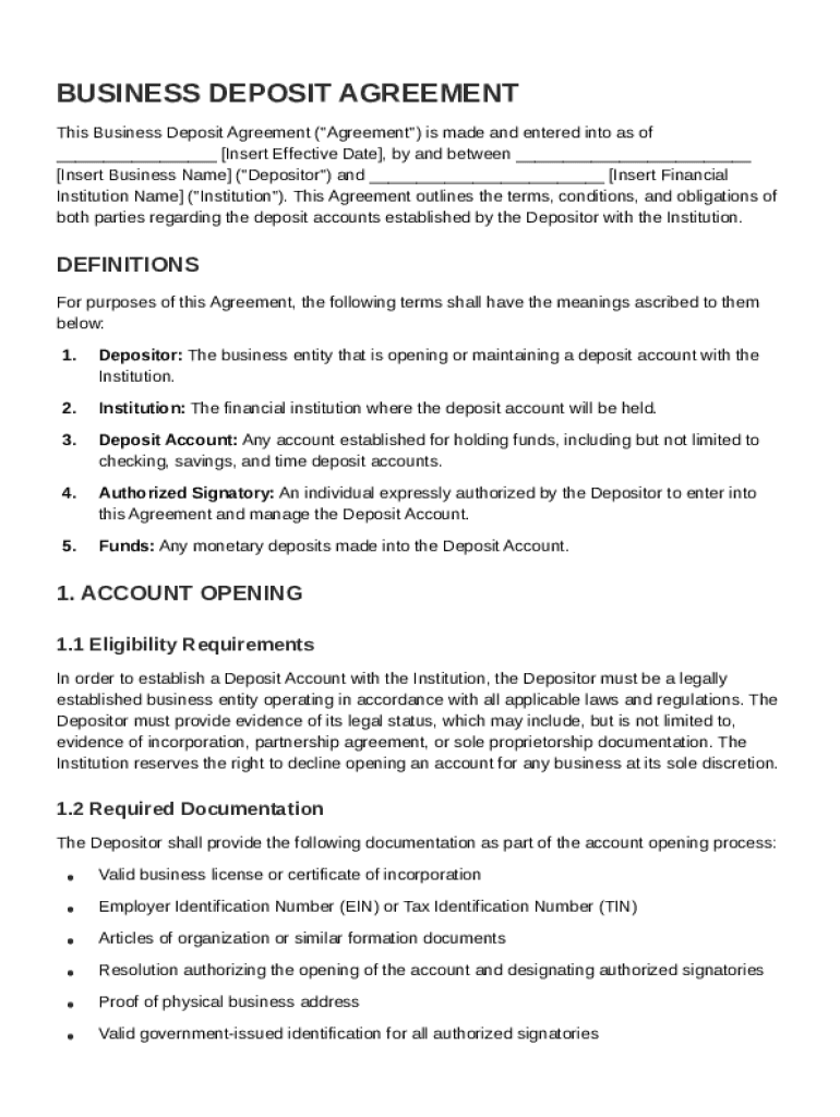 This section covers the vital aspects of the Business Deposit Agreement Template, including its purpose, key provisions, and essential components.