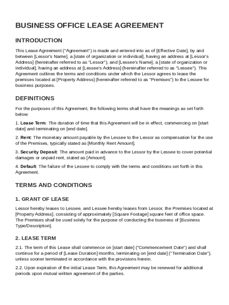 A Business Office Lease Agreement Template is a legal document outlining the terms and conditions under which one party rents office space from another party.