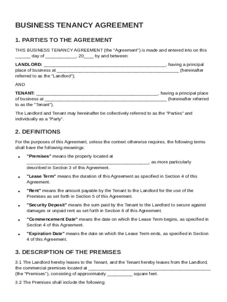 Understanding the detailed components of a Business Tenancy Agreement is vital for both landlords and tenants. Each section serves to clarify expectations and prevent misunderstandings.
