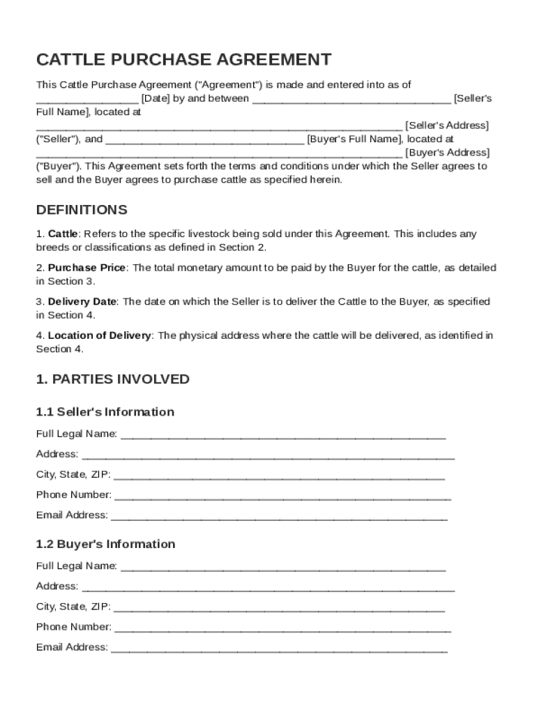 This document outlines the terms and conditions under which cattle are to be sold from a seller to a buyer, including details about the cattle, purchase price, delivery terms, and legal obligations.