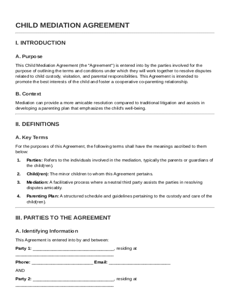 TL;DR: To fill out a Child Mediation Agreement Template, start by reviewing the necessary information, including custody arrangements and visitation schedules. Utilize tools and templates from pdfFiller to edit, sign, and finalize the document, ensuring it reflects the needs of both parties.