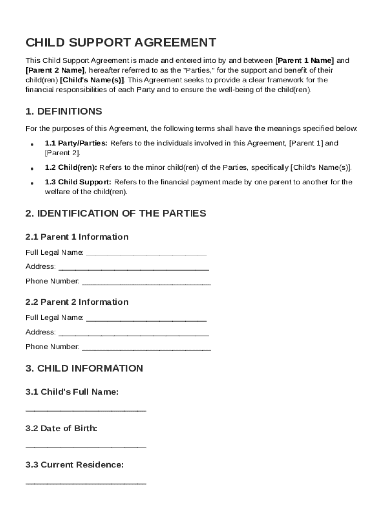 A Child Support Agreement Template is a legal document outlining the financial support obligations of a non-custodial parent to a custodial parent for the care of their child.