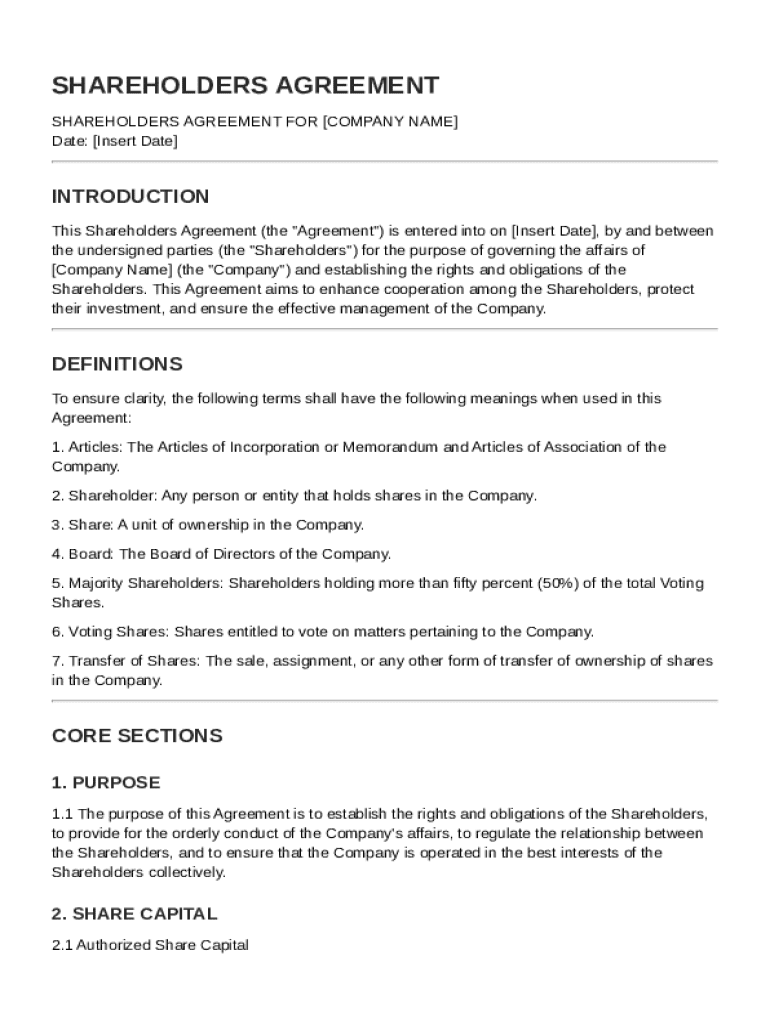 The agreement typically includes sections on Purpose, Share Capital, and different Classes of Shares.