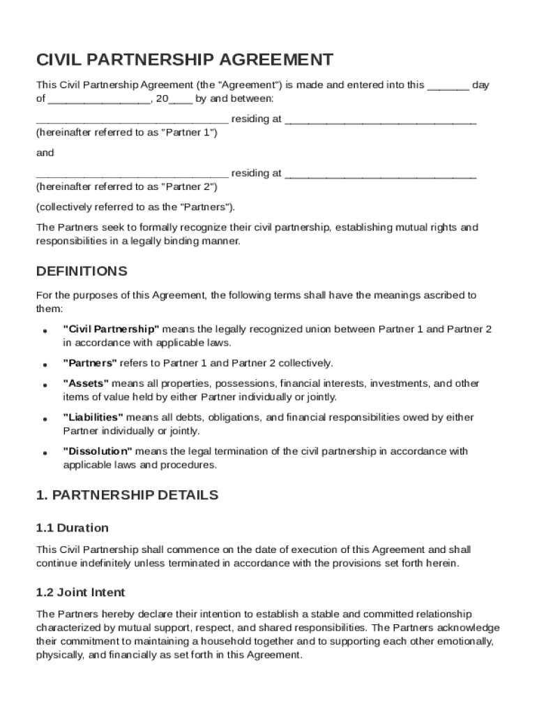 A Civil Partnership Agreement Template is a legal document that outlines the rights and responsibilities of partners in a civil partnership.