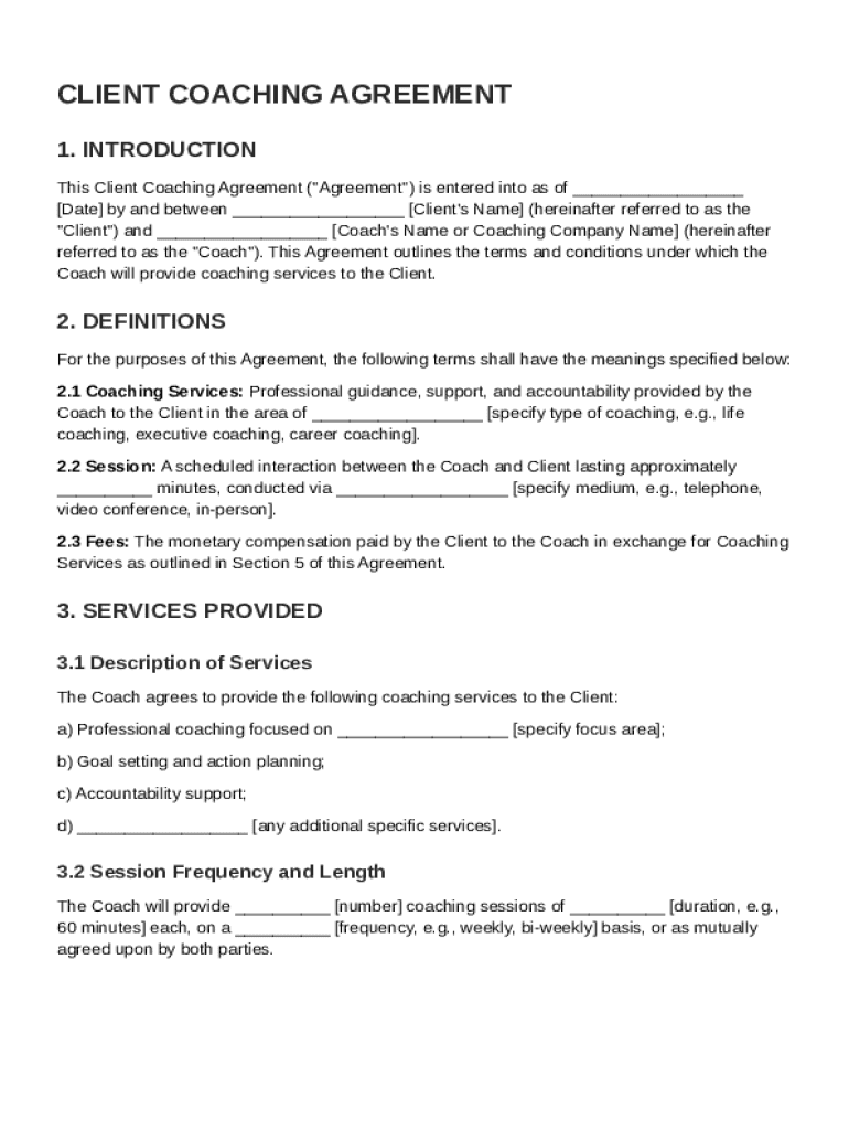 This document outlines the terms and conditions under which coaching services will be provided by the Coach to the Client.