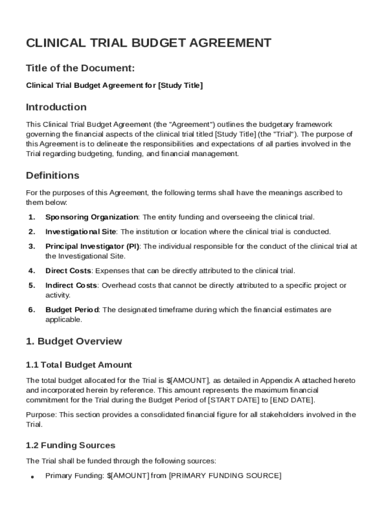 This Agreement outlines the budgetary framework governing the financial aspects of the clinical trial titled [Study Title], detailing responsibilities and expectations regarding budgeting, funding,