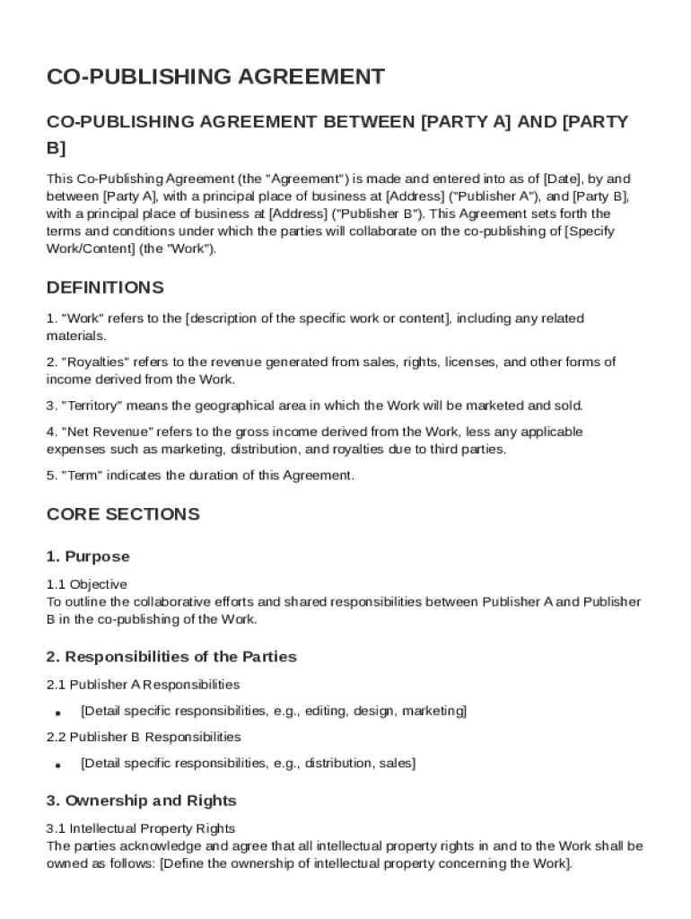 The core components of a co-publishing agreement define the scope of collaboration, roles, and the distribution of profits. They are designed to ensure clarity and comprehension among all parties.
