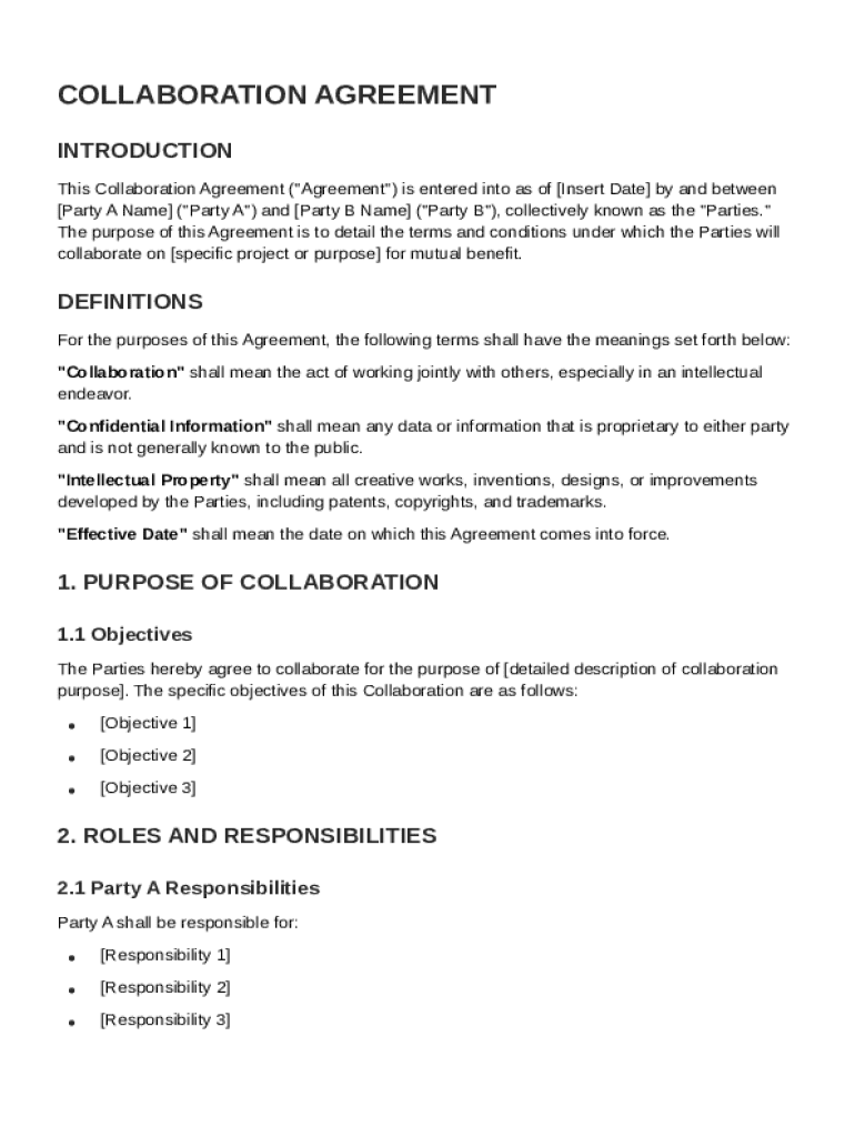 A Collaboration Agreement Template is essential for formalizing relationships between parties collaborating on a project. This template provides a structured format that encompasses all critical aspects of the collaboration.