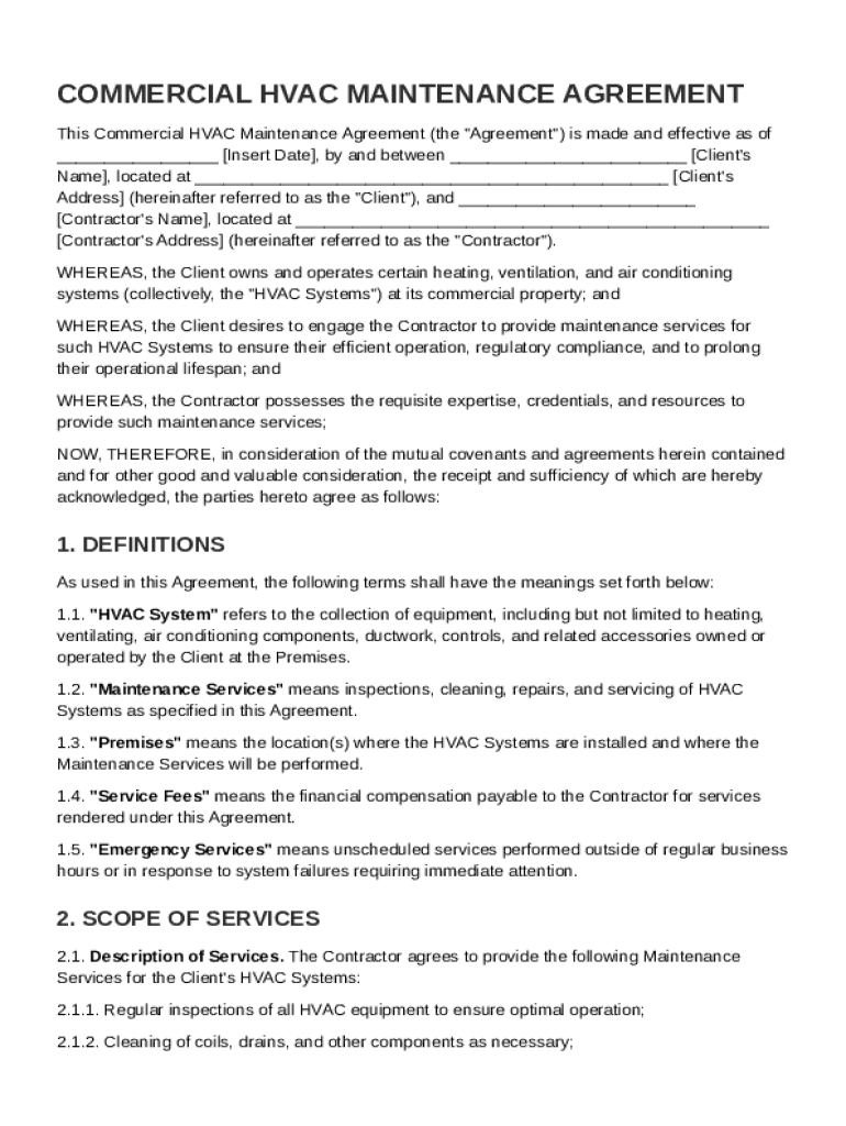 A solid HVAC Maintenance Agreement should include specific details that outline the providers' and clients' expectations and responsibilities. Clarity in these components minimizes misunderstandings.