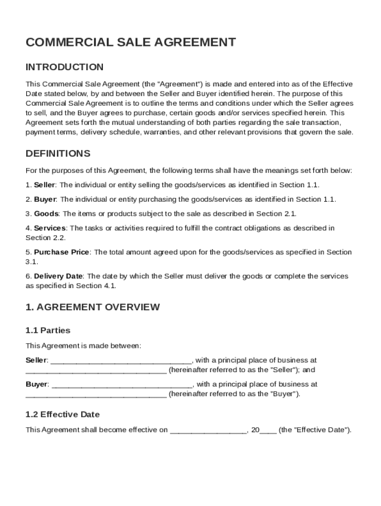 This Commercial Sale Agreement outlines the terms and conditions under which the Seller agrees to sell, and the Buyer agrees to purchase, certain goods and/or services.