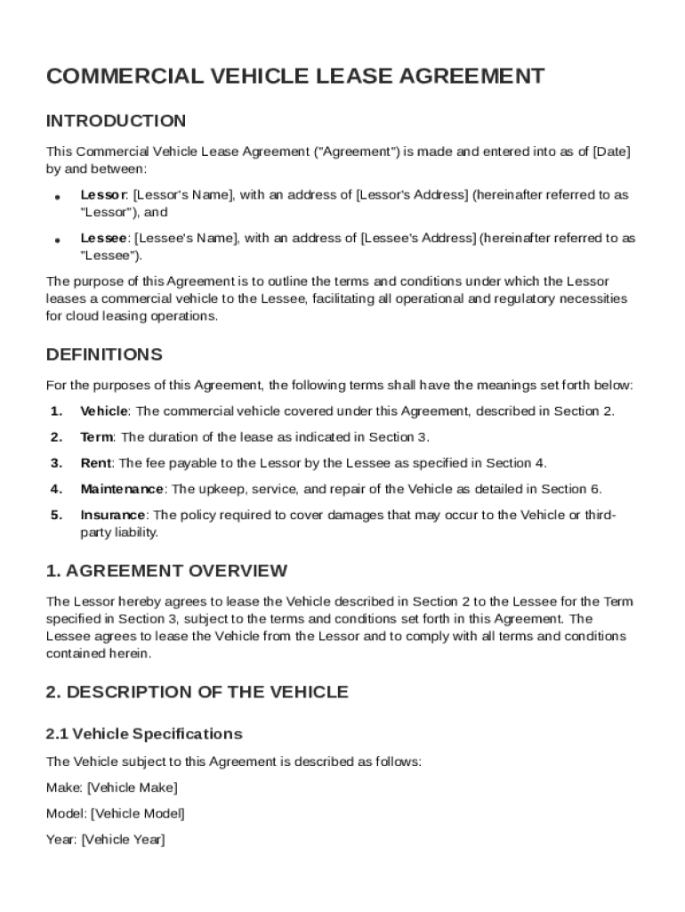 This document outlines the terms and conditions for leasing a commercial vehicle from a lessor to a lessee, including vehicle description, lease term, payment terms, maintenance responsibilities,