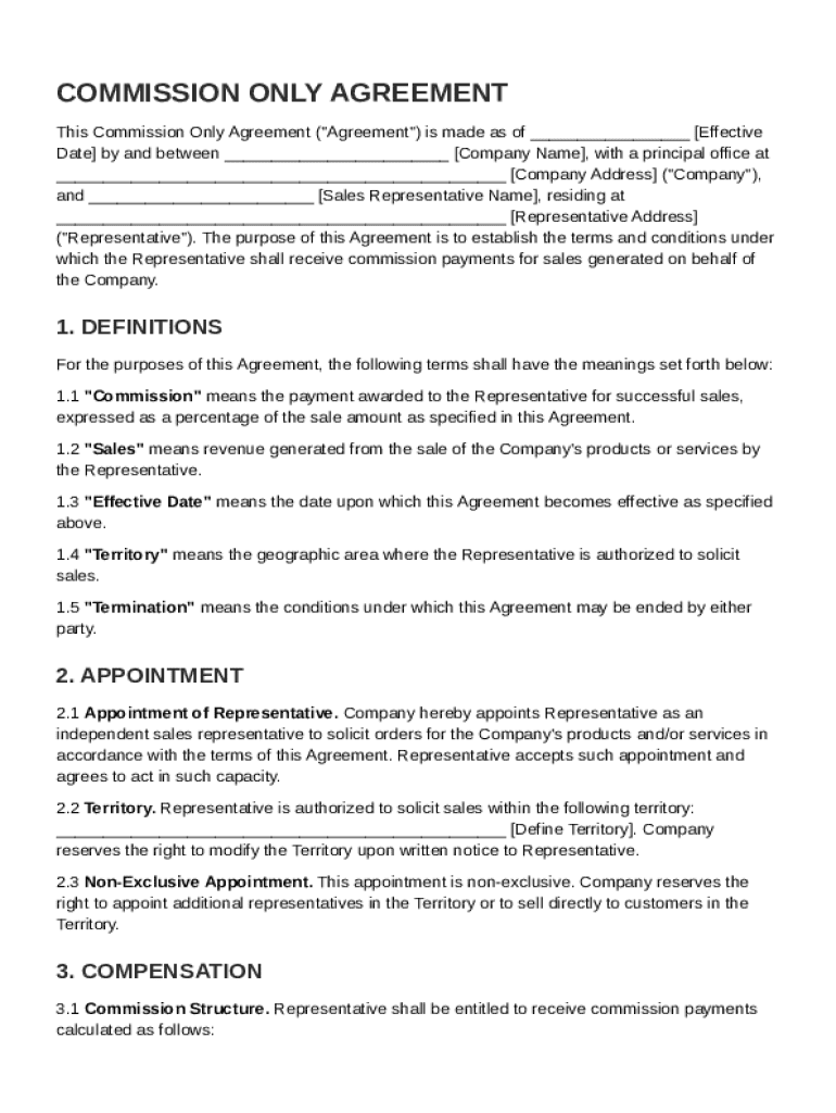 The effectiveness of a Commission Only Agreement lies in its details. Each section must clearly define the responsibilities and expectations of all parties involved.