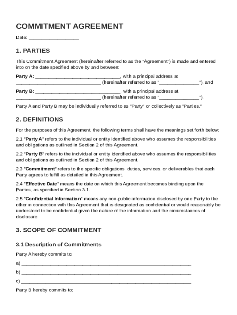 A Commitment Agreement Template is a document that outlines the terms and expectations between parties regarding their obligations and promises.