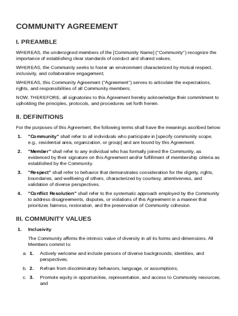 A Community Agreement Template is a document designed to establish guidelines and expectations for behavior within a community or group setting.