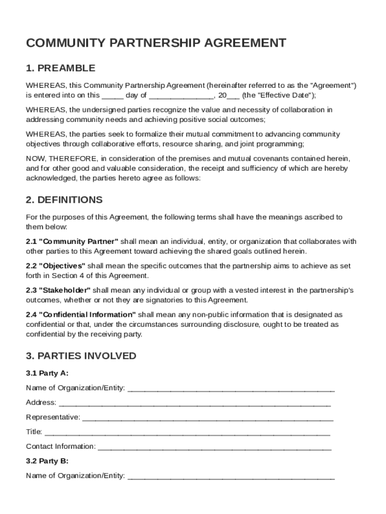 Creating a Community Partnership Agreement Template is essential for formalizing collaborations between organizations and individuals. This document establishes the terms and conditions under which partnerships operate, ensuring clarity and accountability among participants. By following this guide, you can develop an effective agreement that meets your needs.
