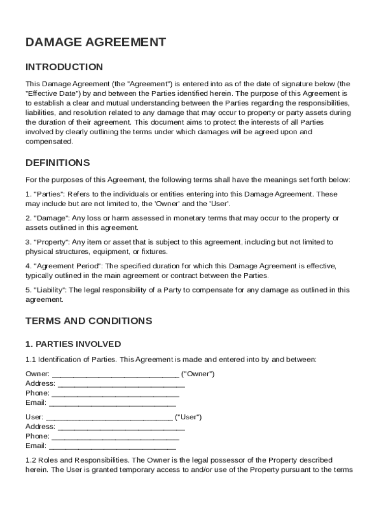 Understanding Damage Agreements is vital in property management. A Damage Agreement outlines the responsibilities of both the owner and the user regarding any potential damages that may occur during the usage of property.