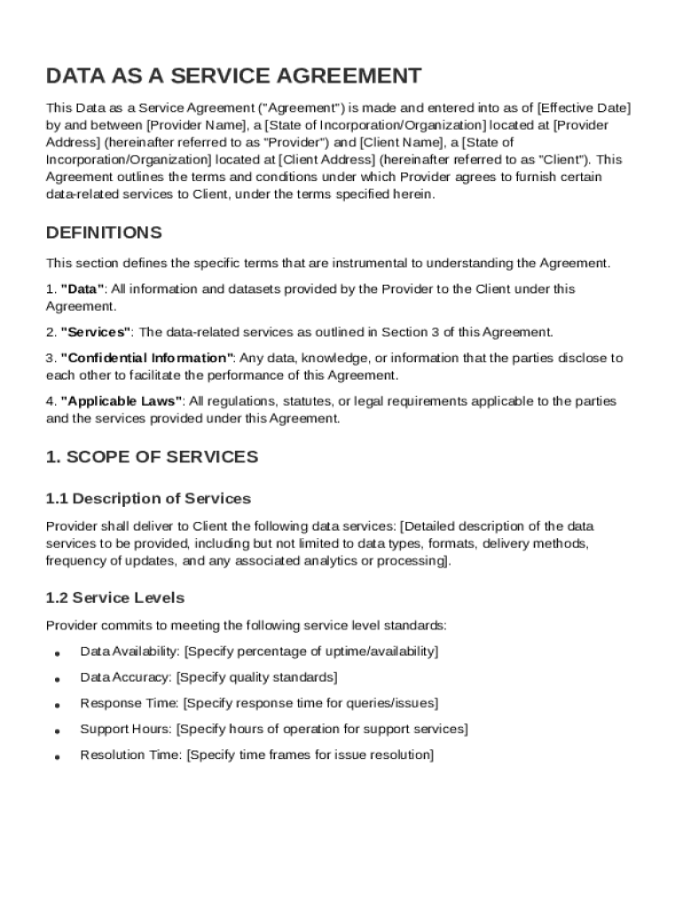 Establishing clear service levels is critical in a Data As a Service Agreement. This includes detailed clauses on data availability, expected uptime, and standards for data accuracy. Moreover, defining response times for issues and support hours enhances client satisfaction and trust in the service.