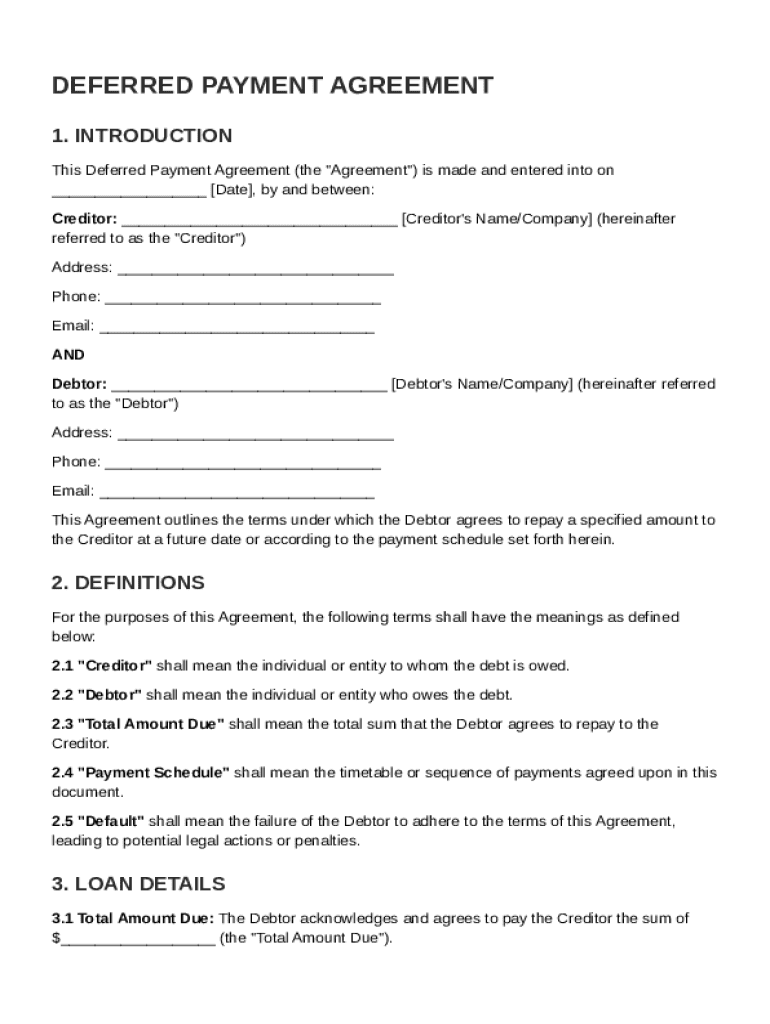 A Deferred Payment Agreement Template is a legal document outlining the terms under which payments will be delayed or made in installments.