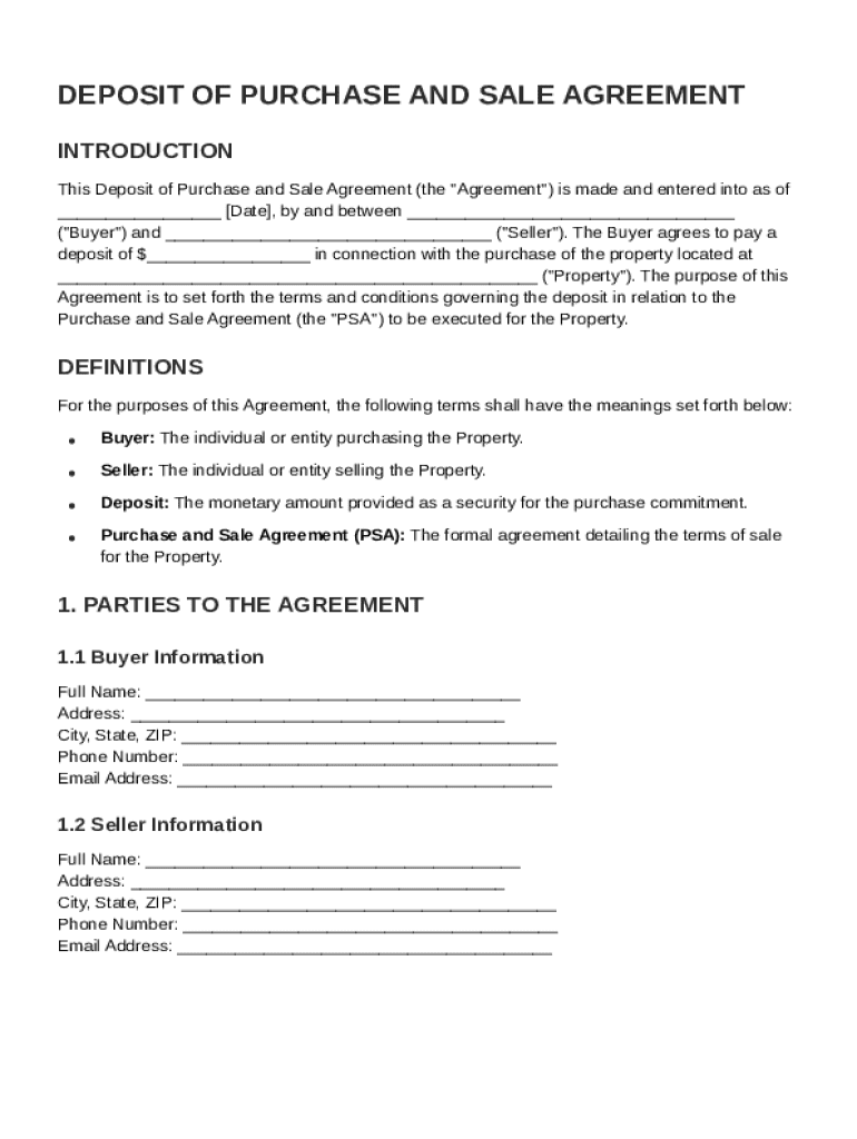 A Deposit of Purchase and Sale Agreement is a legal document that outlines the terms of a real estate transaction. It acts as a commitment from the Buyer to purchase a property and from the Seller to sell it, establishing a legally binding deposit that secures this agreement.