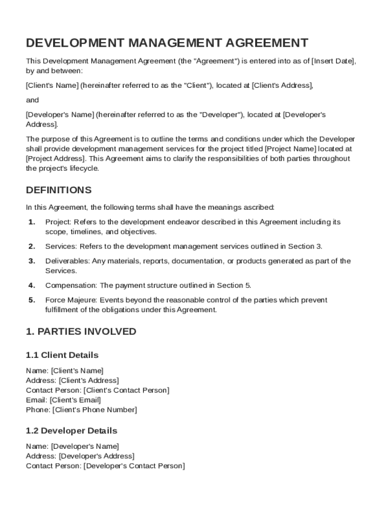 Each Development Management Agreement consists of specific sections that clearly define the roles of each party, key details about the project, and all essential timelines. These components are instrumental in ensuring that all stakeholders are on the same page.