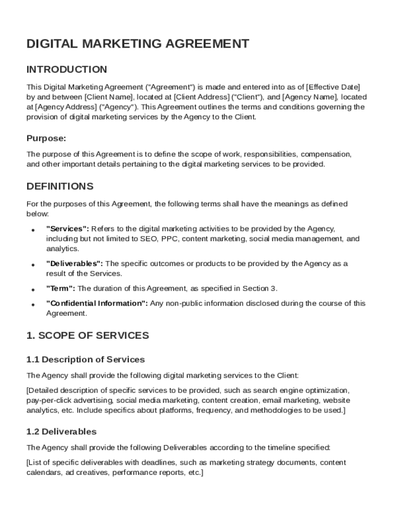 A Digital Marketing Agreement Template is a formal document outlining the terms and conditions of digital marketing services between a provider and a client.