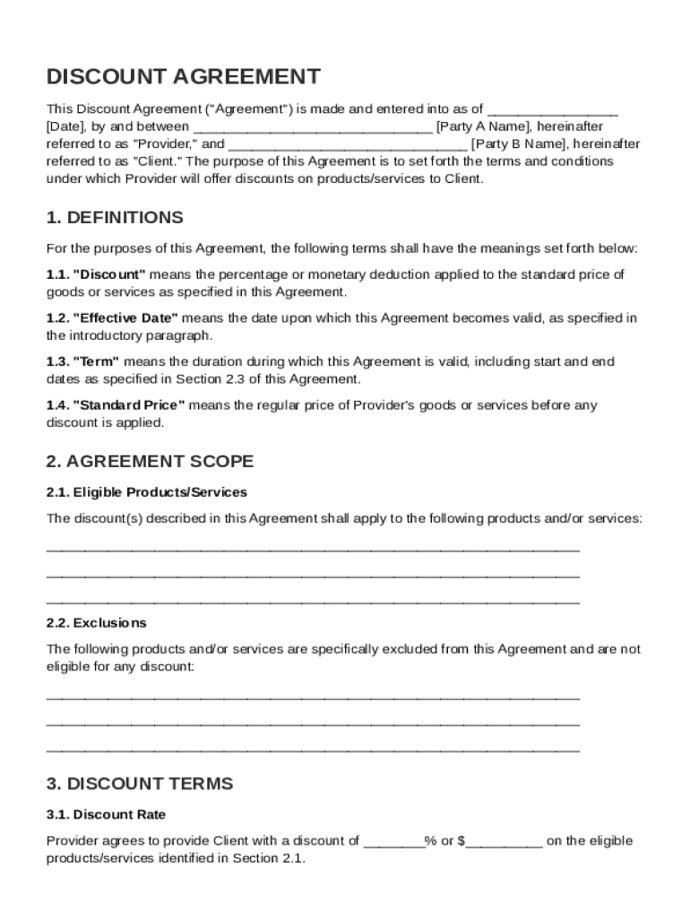 This document outlines the terms and conditions under which a provider offers discounts on products/services to a client.