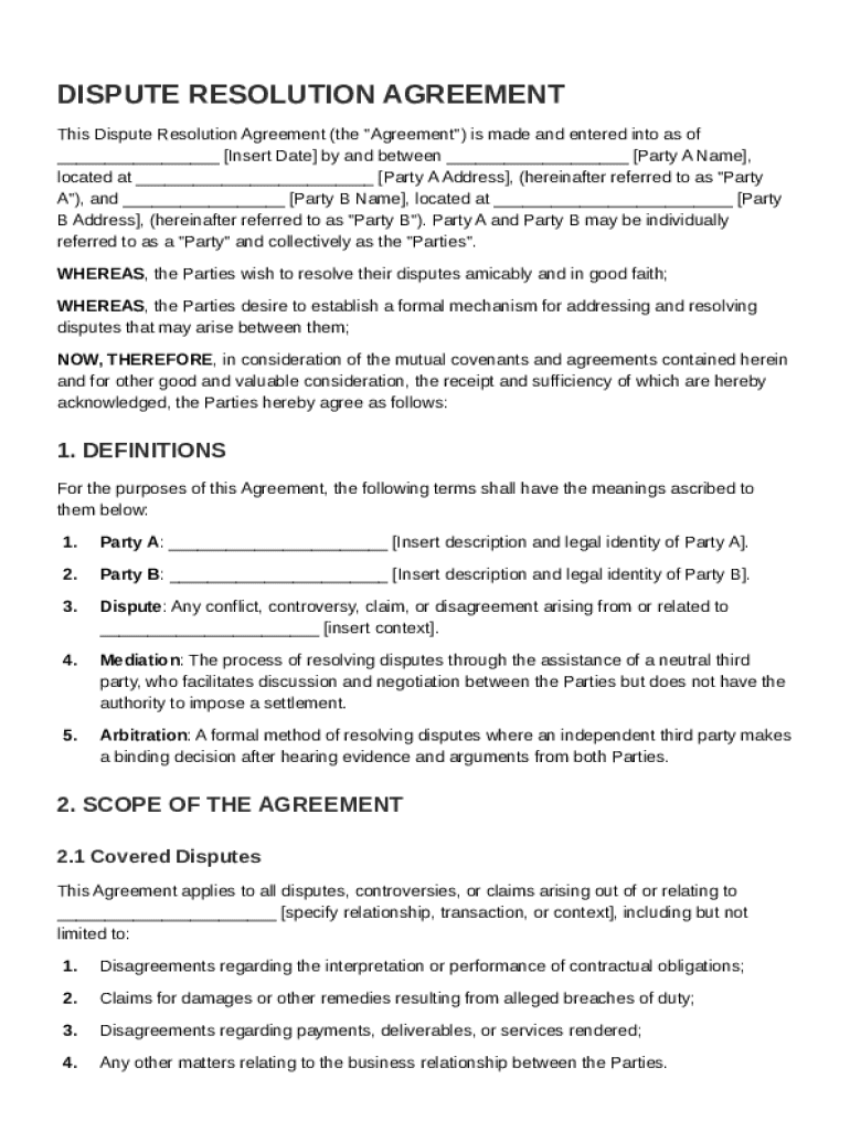 Include key terms such as 'Dispute', 'Mediation', and 'Arbitration' to ensure all parties understand the terms.