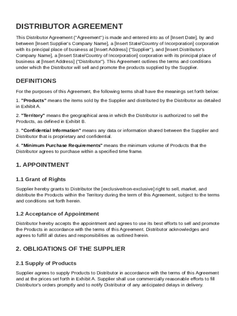 This Distributor Agreement outlines the terms and conditions under which a Distributor is appointed by a Supplier to sell and promote products within a specified territory, including obligations,