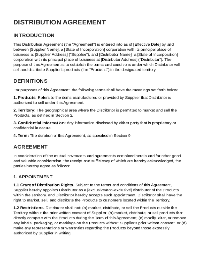 This document establishes the terms and conditions under which a Distributor will sell and distribute a Supplier\'s products in a designated territory.