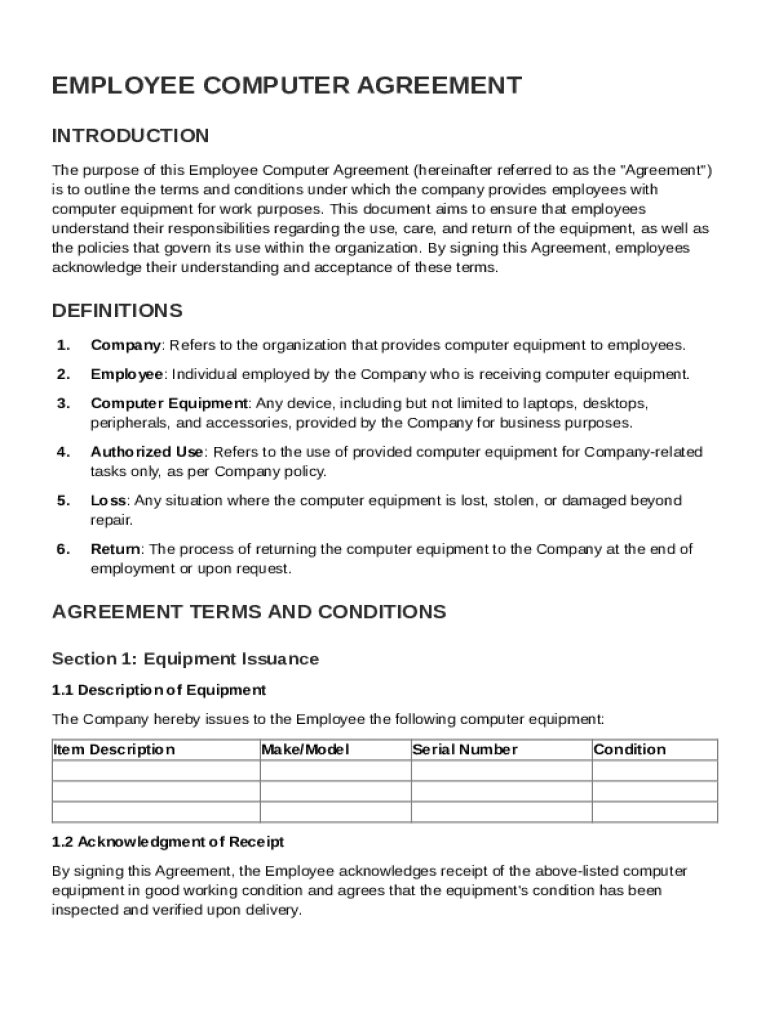 Understanding key terminology is crucial for accurate interpretation of the agreement. Knowing how terms like 'Company', 'Employee', and 'Computer Equipment' are defined ensures compliance and clarifies responsibilities.