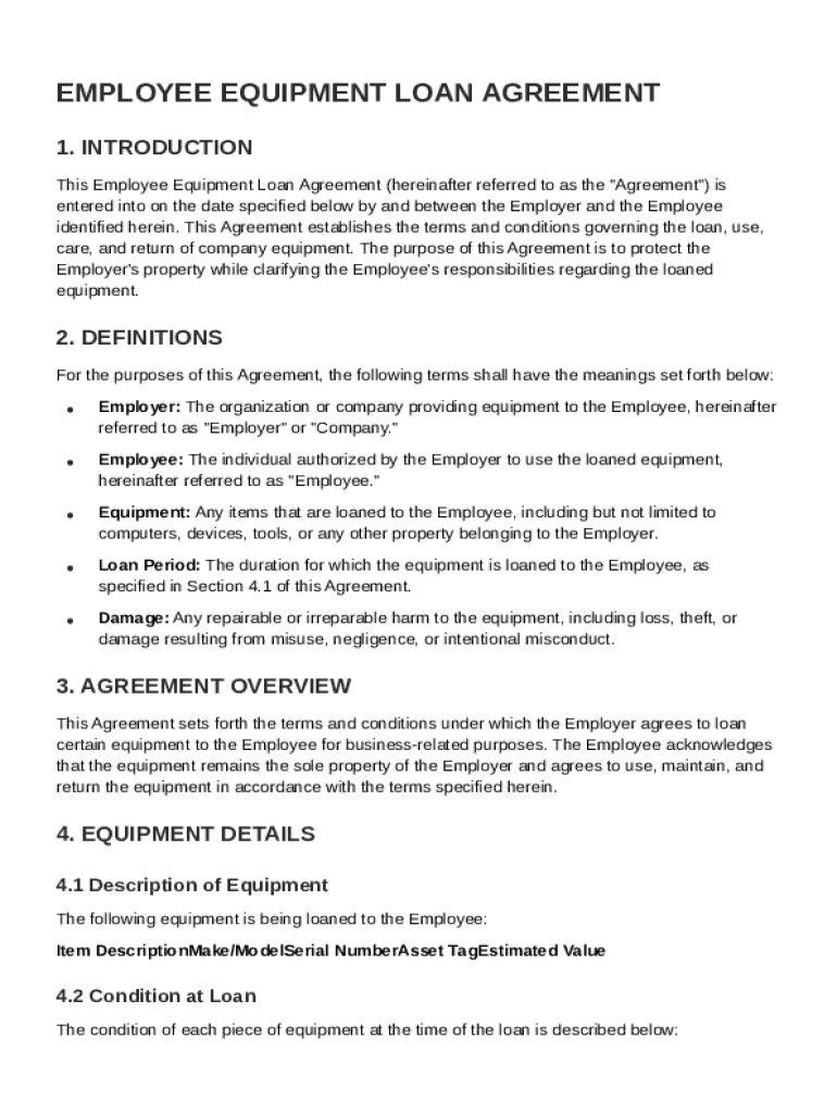 An Employee Equipment Loan Agreement is a legal document that establishes the terms under which employees can borrow equipment from their employer. It serves not just as a record but also as a guide for both parties to understand their rights and obligations.