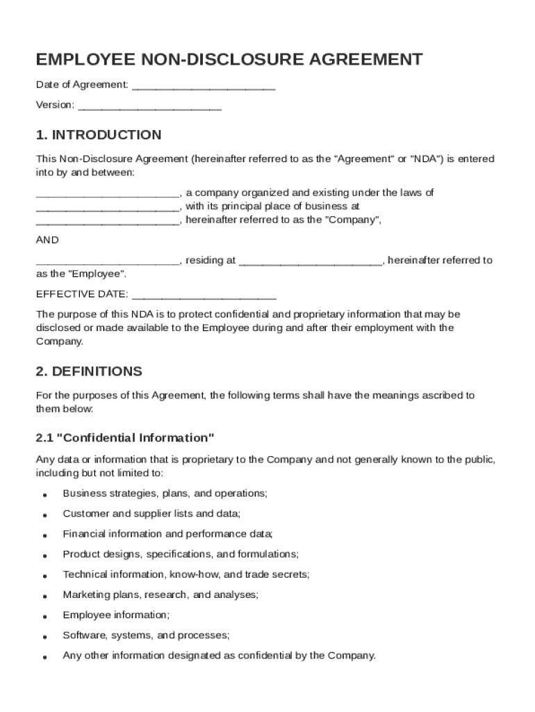 An Employee Non Disclosure Agreement (NDA) is a legal contract intended to protect confidential information shared between an employer and an employee during their working relationship. Its primary significance lies in ensuring that sensitive company information, such as trade secrets and proprietary processes, is kept confidential. This agreement not only safeguards the company's information but also protects employees from the potential legal consequences of mishandling sensitive data.