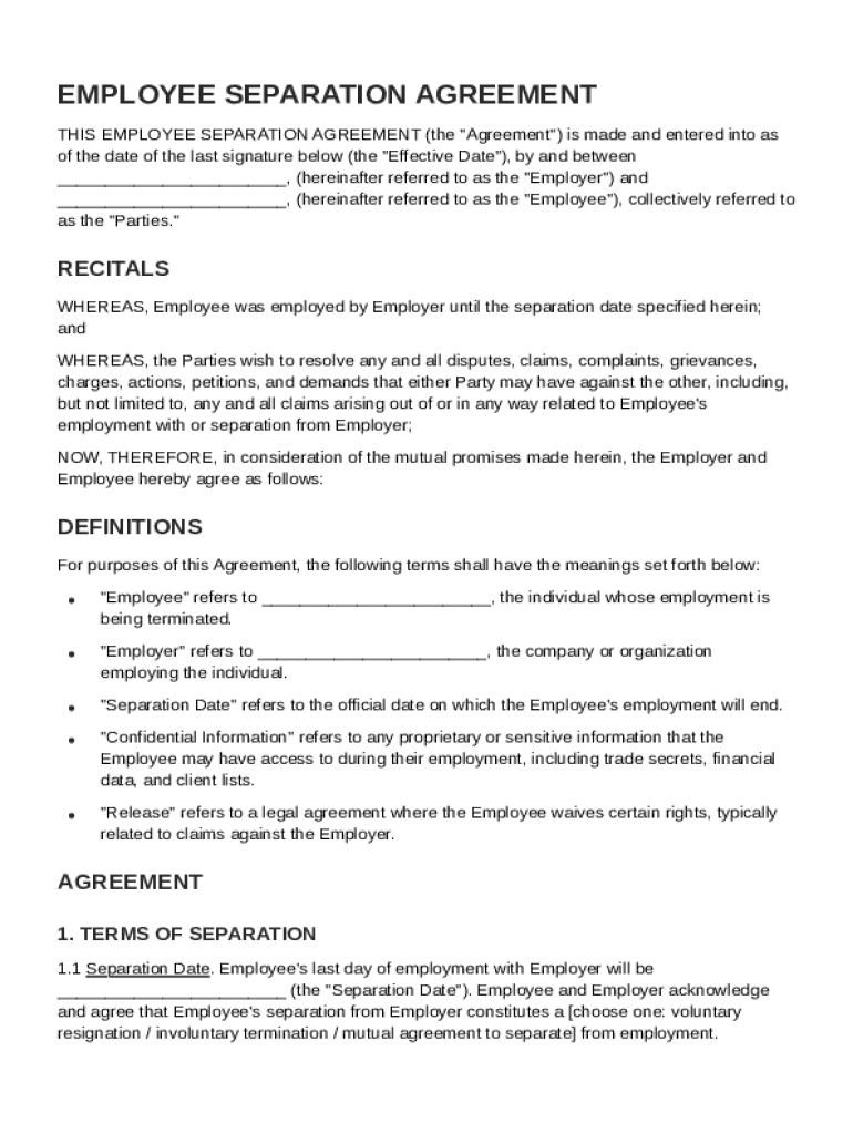 An Employee Separation Agreement Template is a legal document outlining the terms and conditions of an employee's departure from a company.
