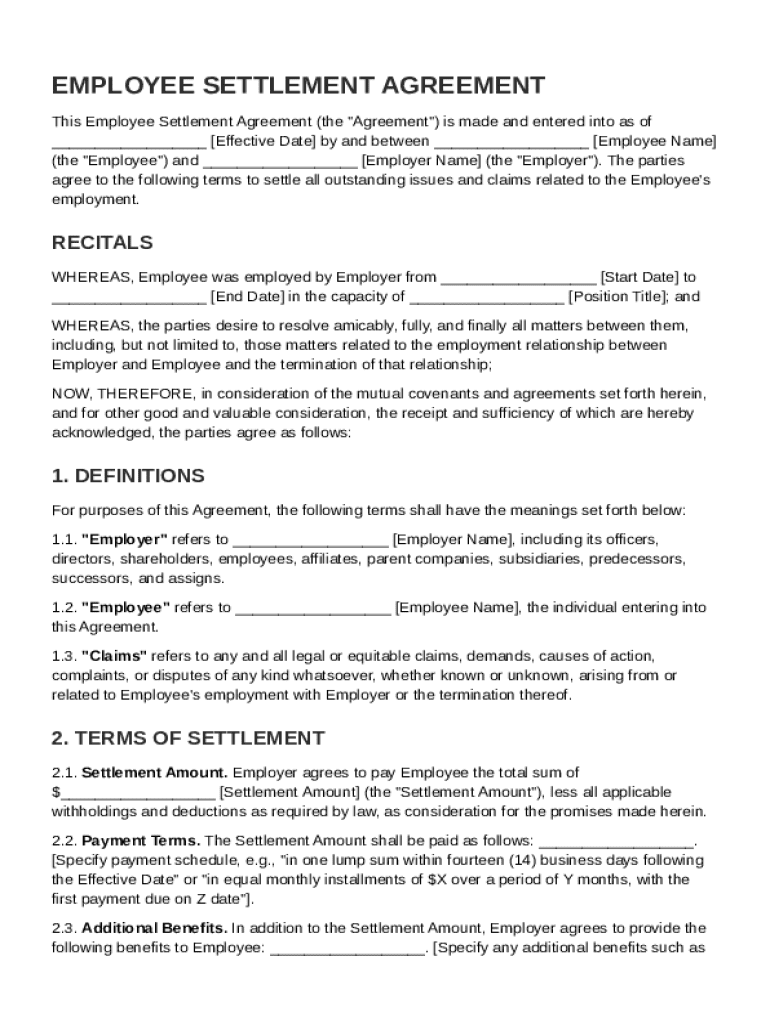 An Employee Settlement Agreement Template is a legal document outlining the terms of a settlement between an employer and an employee regarding employment disputes.